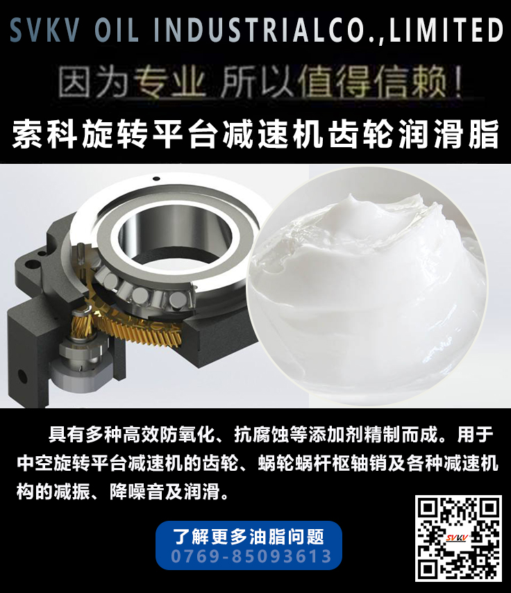 索科中空旋轉平臺交叉滾子軸承潤滑脂 是由全合成油和獨特的添加劑制成,具有強韌的油膜,生成的潤滑油膜可在軸承運行中持久有效地保持軸承內部摩擦表面的分離,確保軸承少磨損甚至無磨損地運行。用于中空旋轉平臺減速機交叉滾子軸承使用。適應性好,具有高低溫性能,南北方通用;啟動力矩小,運轉力矩低,功耗少,溫升低;優異的重載潤滑能力,優異的熱穩定性和機械穩定性;可用于耐沖擊負荷及磨損,具有良好的防銹作用;可用于防止振動,擺動腐蝕及延長潤滑周期;抗老化能力強,可提高機械因連續運行安全可靠性。