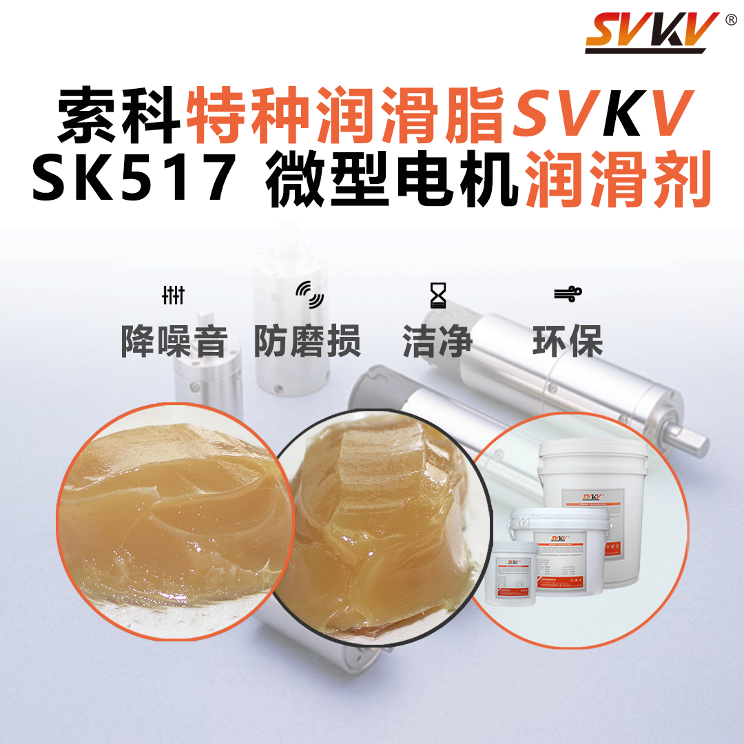 推薦索科SVKV SK517系列微型電機潤滑脂。減少電機中齒輪磨損,降低噪音,達到長壽命和防水的效果。適用中低轉速的齒輪、軸承,塑膠/塑膠、金屬/塑膠的潤滑、消音、降電流等效果。